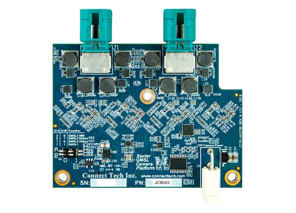 Connect Tech's GMSL camera platform is an expansion board that allows up to 8 cameras to be connected to the Jetson AGX Xavier module. Since many different types of GMSL cameras are available, the JCB002 has user selectable options to interface with either GMSL1 or GMSL2 protocols at different operating frequencies. Power to the cameras is provided by PoC (Power over Coax) so all the data, control signals, and power are sent through a single 50 Ohm Coaxial cable. This allows for flexibility in cable routing and ease of installation in automotive applications.