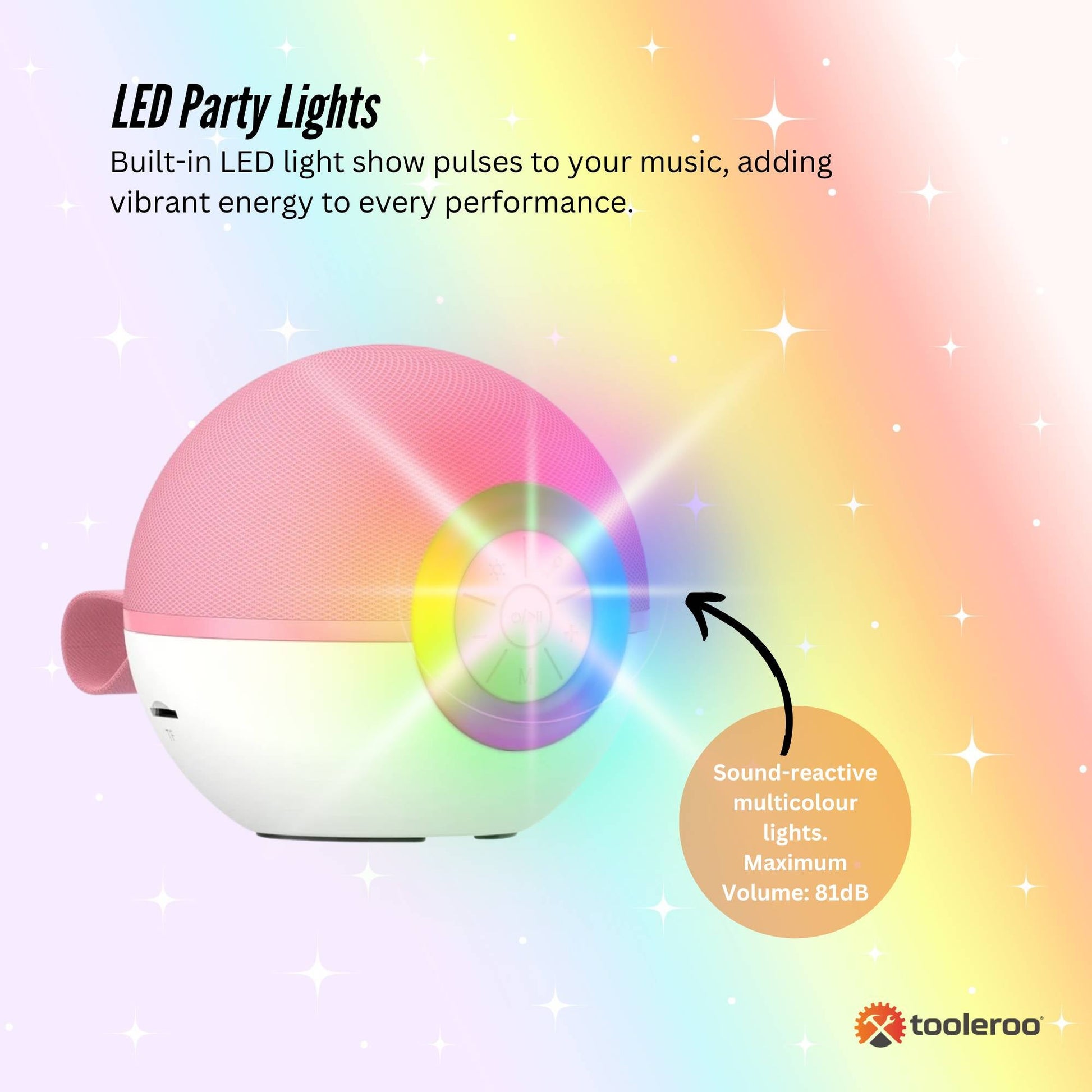 - LED Party Lights – Built-in LED light show pulses to your music, adding vibrant energy to every performance.